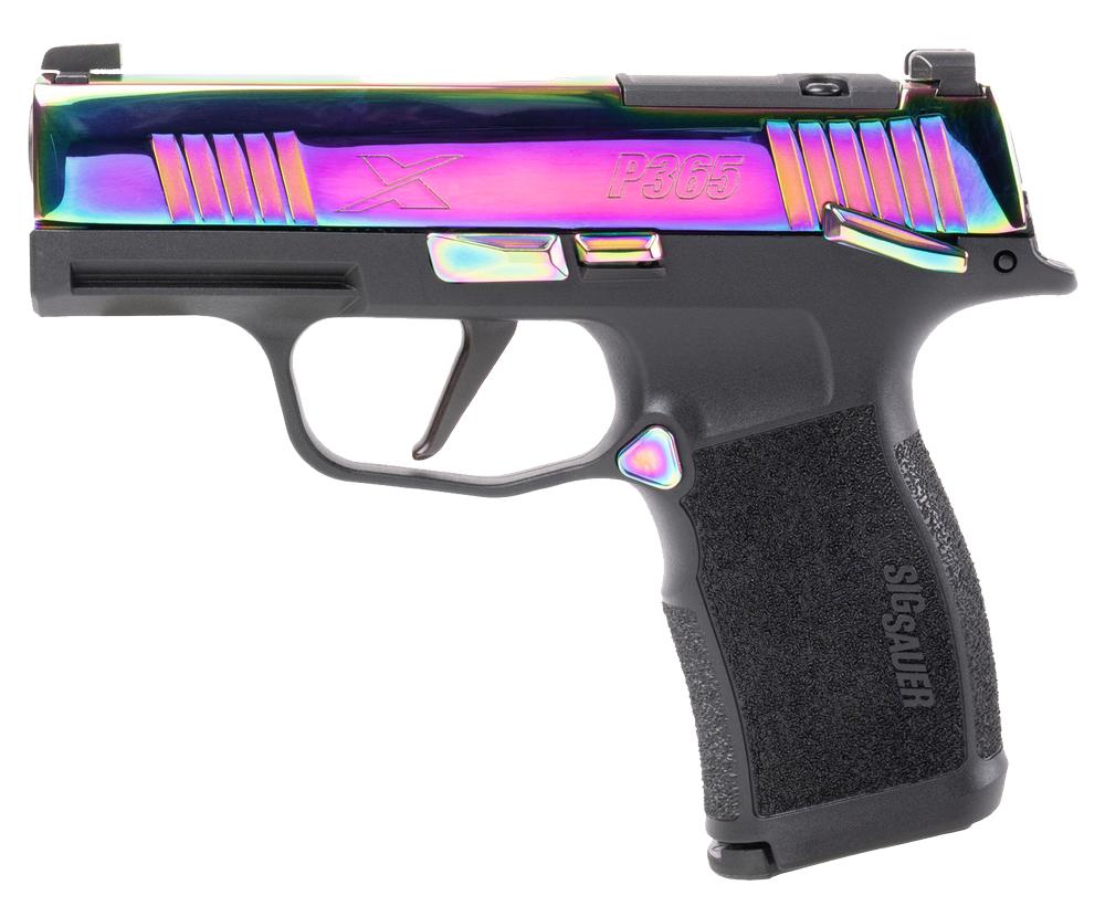 The P365x Rainbow features rainbow titanium finished slide, magazine catch, manual safety, slide catch, X-Series modular polymer grip and takedown lever. The slide includes a removable sight plate, XRay3 Day/Night sights in rear dovetail configuration, compatible with all RomeZero Optics as well as the RMS-C footprint. Includes two 12rd magazines.